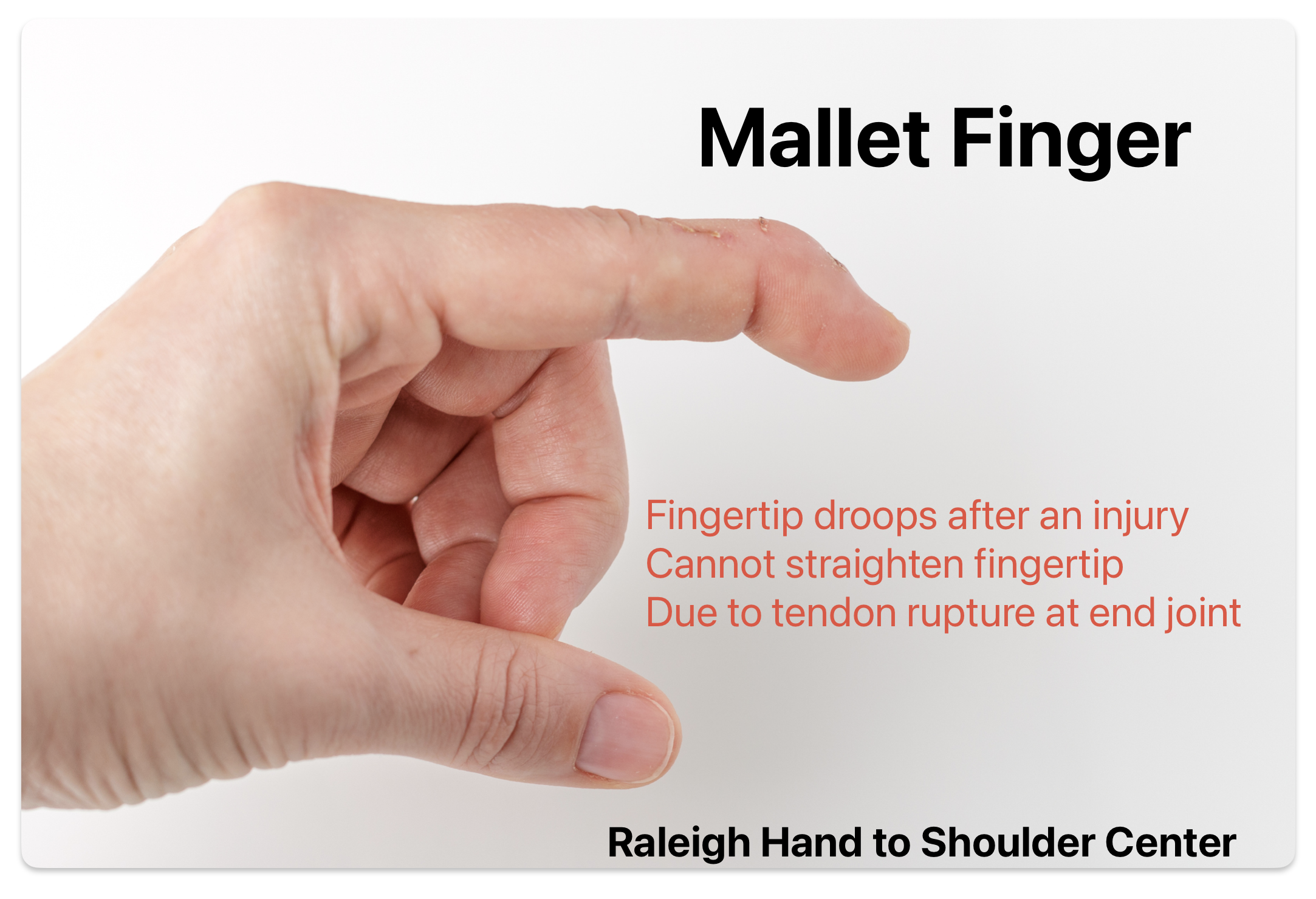 A mallet finger is caused by tearing of the tendon which straightens the finger at the end knuckle. This causes the fingertip to droop and patients are unable to straighten the fingertip on their own. The terminal extensor tendon is responsible for extending the distal interphalangeal joint (DIP), the joint closest to the nail. Without proper function of this tendon, the finger will not straighten on its own. Occasionally, a piece of bone attached to the tendon has fractured, which can also cause the same problem. When a fracture occurs in this injury, this is called a “bony mallet.”