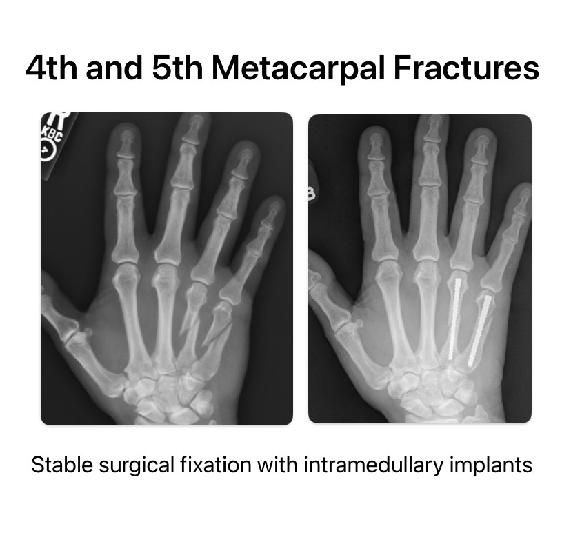 Images below are from a patient with 4th and 5th metacarpal shaft fractures in the hand. The fractures were displaced and unstable, requiring surgery to improve the patient’s hand function. ORIF with plates and screws was performed and a good result was achieved for the patient.